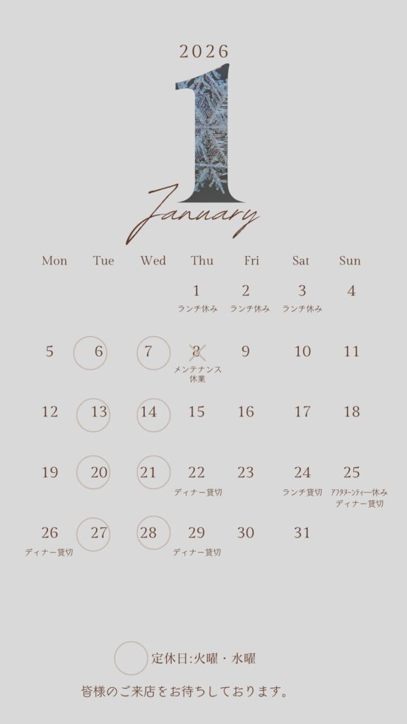 ※ご予約状況により、営業日となっているお日にちもご予約が難しくなる場合がございますことご了承くださいませ。